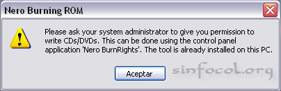 Ahora viene lo interesante, cuando ejecutamos nero en la cuenta sin permisos y seleccionamos los datos para grabar en algún CD, nos aparece un mensaje como este