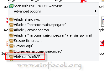 Además, este archivo termina con extensión "exe", lo que nos indica que es un archivo ejecutable, y los que esten familiarizados con el icono del narcomensaje original, saben que es un archivo ejecutable generado por Winrar/Winzip llamado SFX. Si le damos click derecho, vemos que se asocian las opciones del winrar al menú contextual, así que le damos click en "Abrir con WinRar"