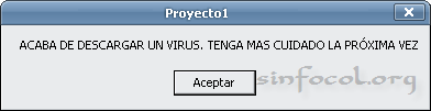 MsgBox "ACABA DE DESCARGAR UN VIRUS. TENGA MAS CUIDADO LA PRÓXIMA VEZ"