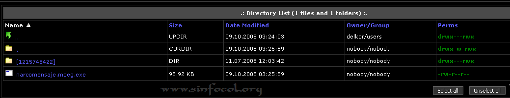 Y luego de obtener acceso al servidor, podemos observar los archivos que tienen allí guardados, y vemos el "narcomensaje.mpeg.exe".