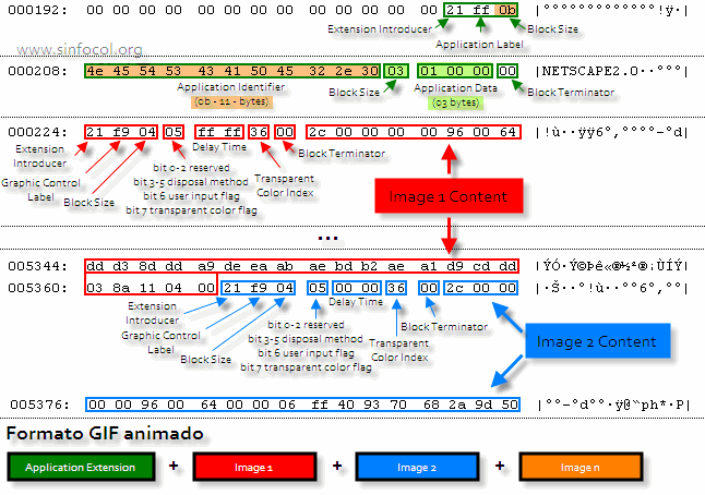 En verde, se encuentra la extensión de la aplicación, la string NETSCAPE2.0 está definida por la longitud en el tamaño del bloque, inmediatamente después de ésta extensión, se encuentra la primera imagen, la cual se compone de una cabecera, un byte que maneja tres atributos: color transparente, entrada del usuario y método x; dos bytes que indican el tiempo que transcurre antes de pasar a la siguiente imagen, cada byte son x/100 segundos (Donde x es el valor que le otorguemos a este atributo), el index del color transparente, un byte que indica que ha terminado la cabecera de la imagen y el contenido de la imagen como tal.