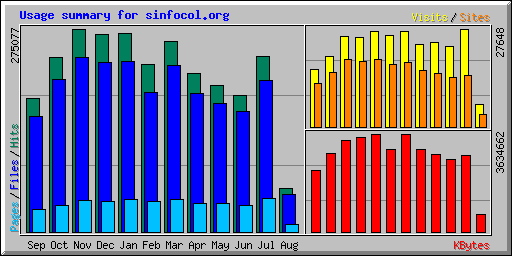 Este año fueron servidos 34561709 bytes a los clientes para un total de 270462 visitas, 447347 páginas servidas, 2256618 archivos consultados y 2609318 hits.
